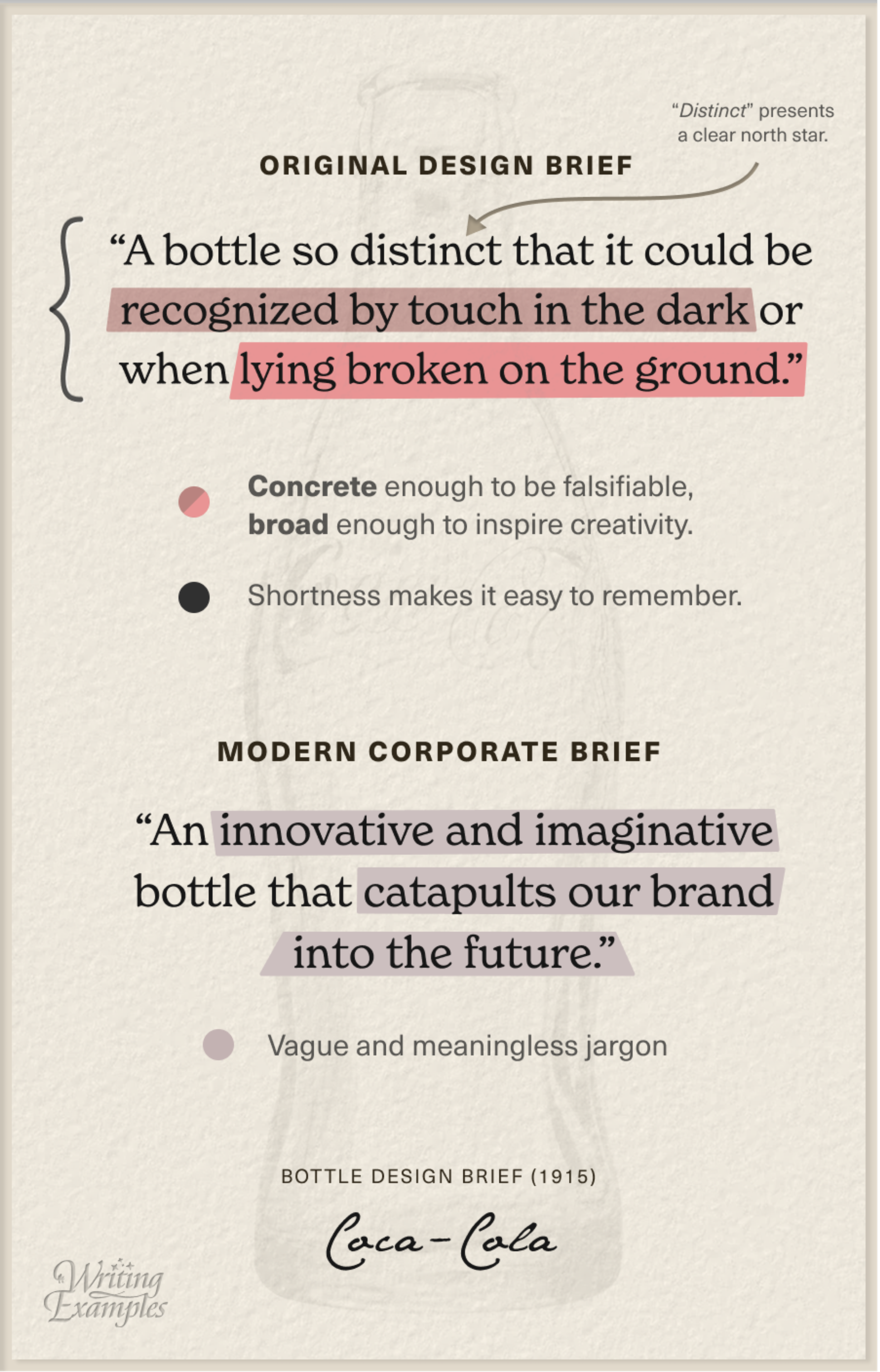Concreteness is the antidote to Corporate Speak. In this case, the typical boardroom design brief statement would’ve read something like: “An innovative and imaginative bottle that catapults our brand into the future.” Though this vision is similar, it lacks the concreteness that makes the 1915 Coca-Cola one so effective.