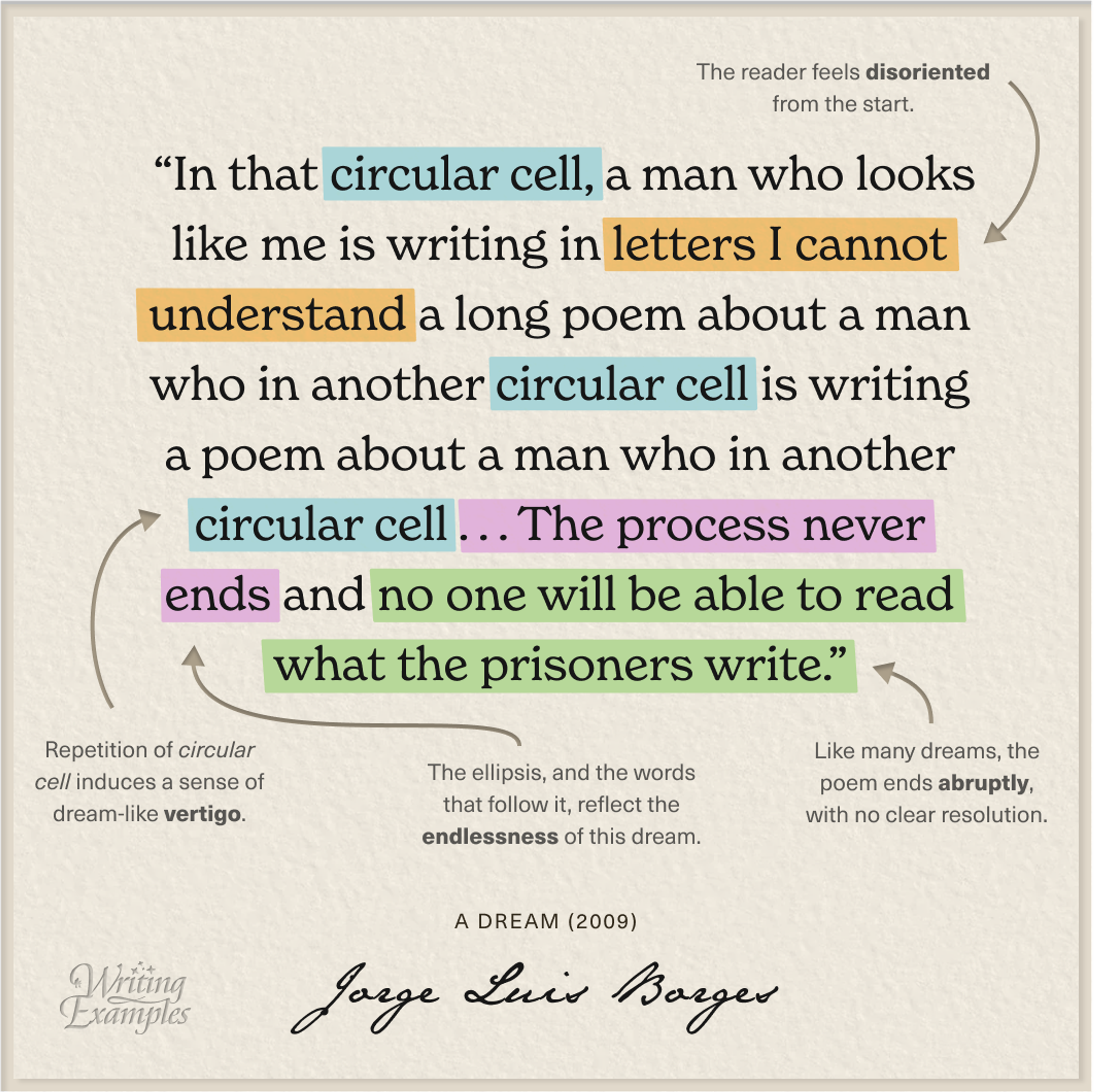 Borges starts by pulling the reader into a dream state. It’s easy to get lost in his first few words, and that’s exactly the point. The circularity of the writing mirrors the circularity of the cell, and the spiral keeps spinning and spinning and spinning, with no end point…