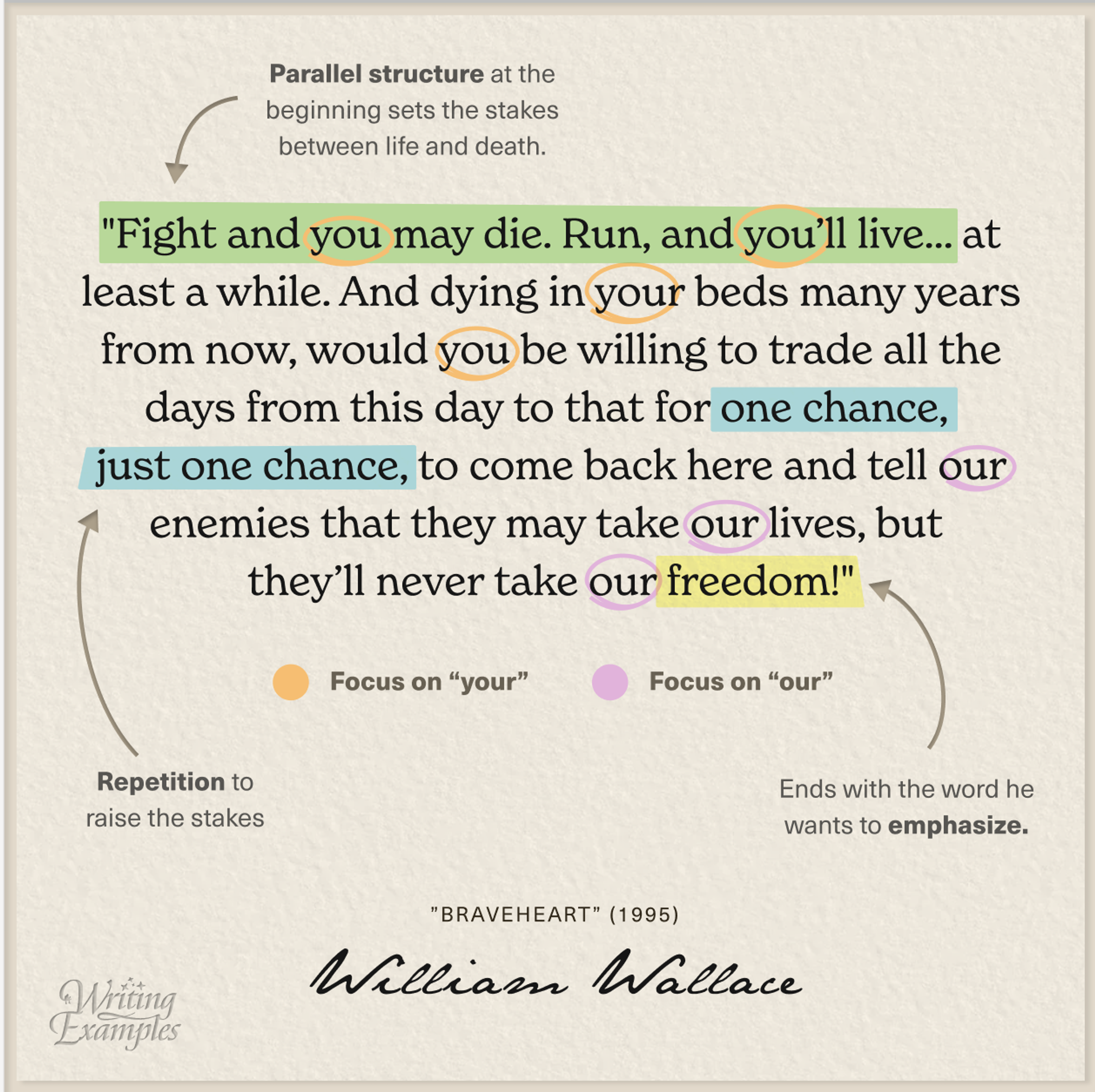 This speech moves from a focus on the individual to a focus on the group: The main point is that the death of an individual can secure the life of the group — and it’s the group that Wallace and his men must prioritize. There are four mentions of the word “you” at the beginning. At the end, the focus shifts to “our” and there are three mentions of it. By moving from the individual to the collective, Wallace unites the soldiers under a common vision. He starts with “you” to connect to each soldier directly. He relates to their fears and reminds them of their choice: to run or to fight. The shift to “our” is a reminder that the group is more important than any individual, and it’s the soldiers’ duty to serve their country.