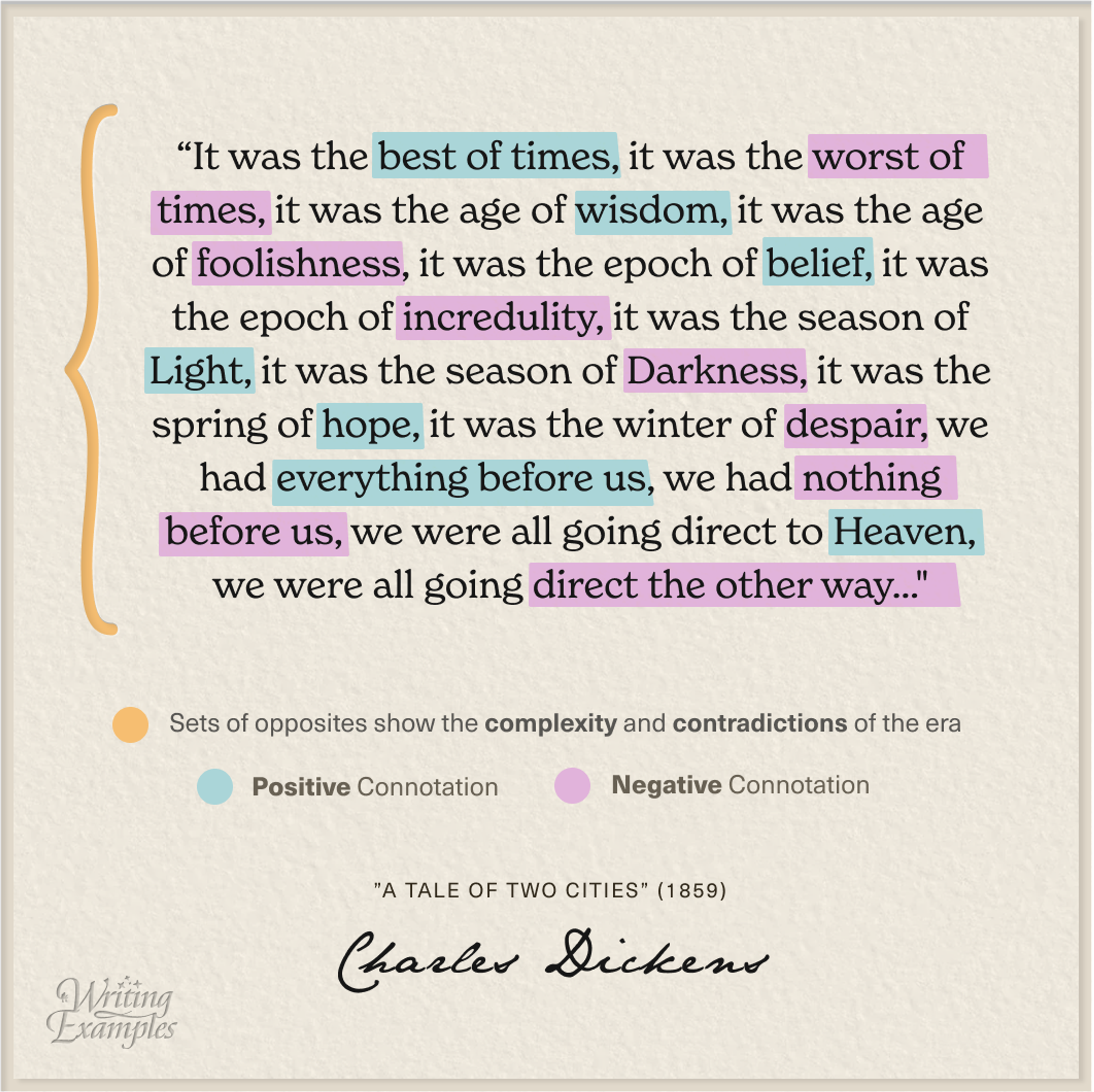 Like Dickens, you can show the complexity of an era by highlighting the contradictions within it. Doing so will help your reader understand the complexity of the scene viscerally, rather than conceptually. No need to complicate things. All you need is a list of opposites. Here, we have: best vs. worst, wisdom vs. foolishness, belief vs. incredulity, light vs. darkness, hope vs. despair, everything vs. nothing, heaven and hell.