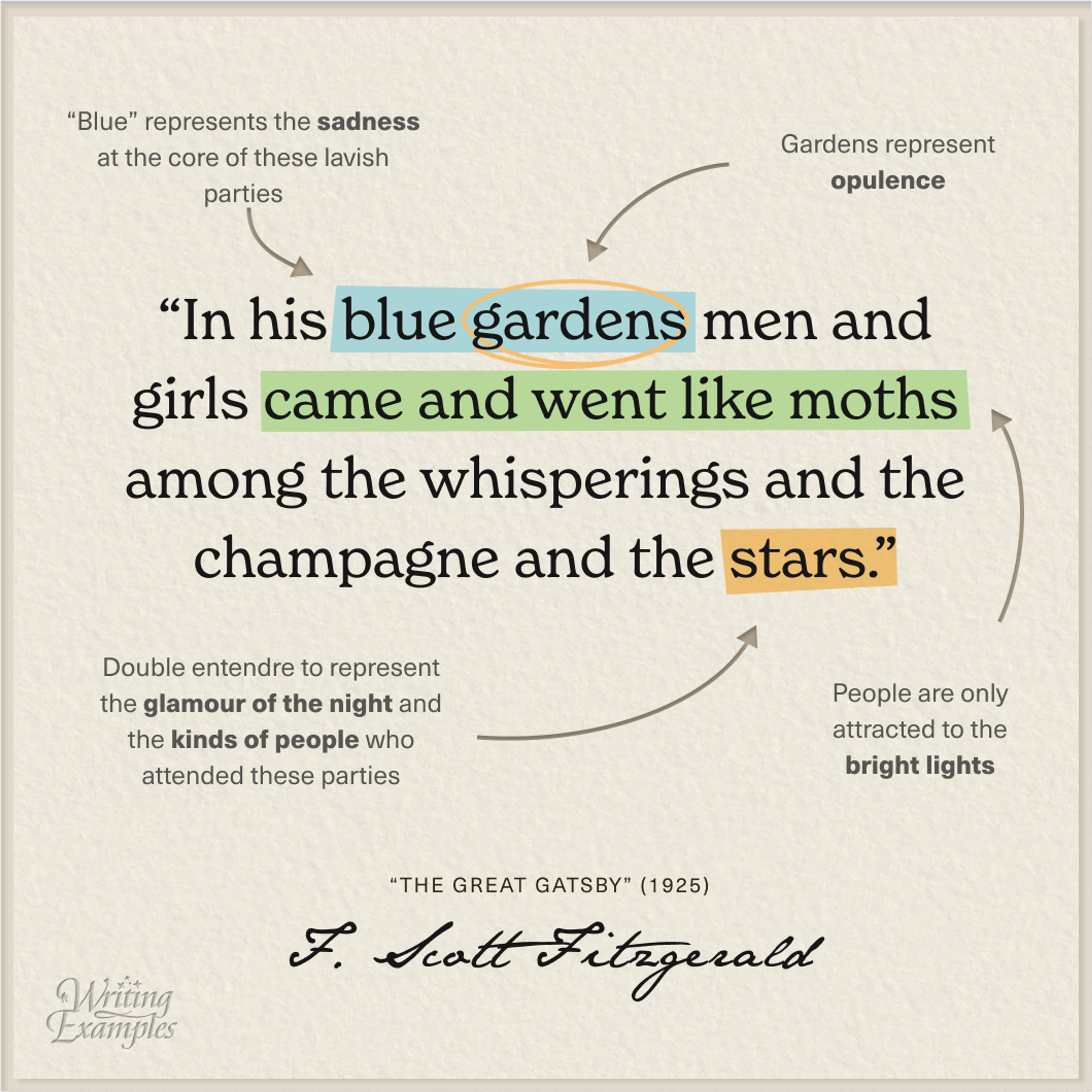 Second, it focuses on people. Instead of saying, “the party was made up of superficial friends who flocked to Gatsby for his money,” Fitzgerald tells us that the guests “came and went like moths.” They were only attracted to the bright lights. This colorful metaphor communicates the same meaning in fewer words, and without breaking the action of the party.