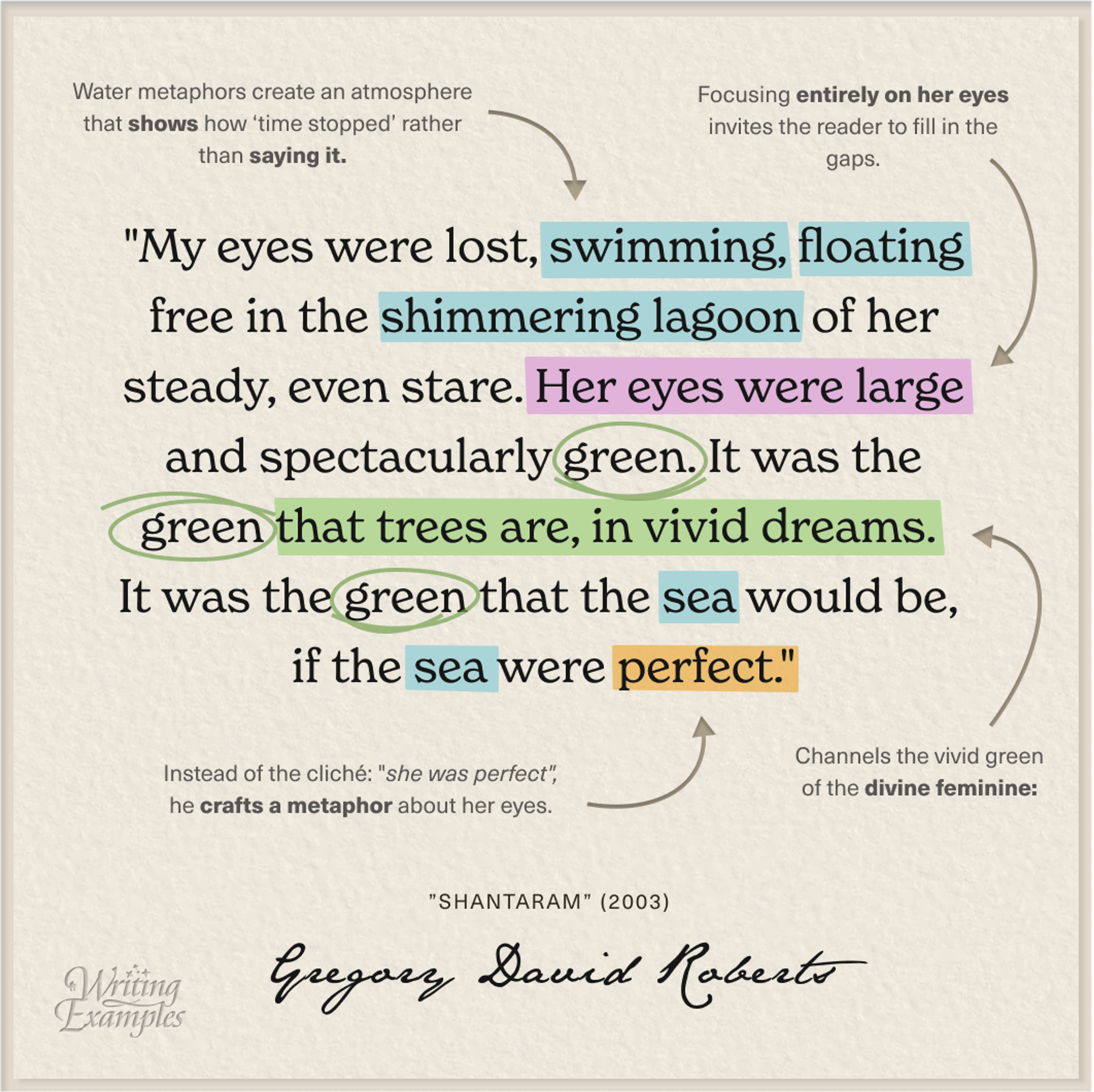 But that’s not what Gregory David Roberts does here. Rather than cataloging each of her physical features, his description is selective. He focuses on two details (eyes and a single color) to express his emotional state in the presence of her beauty.