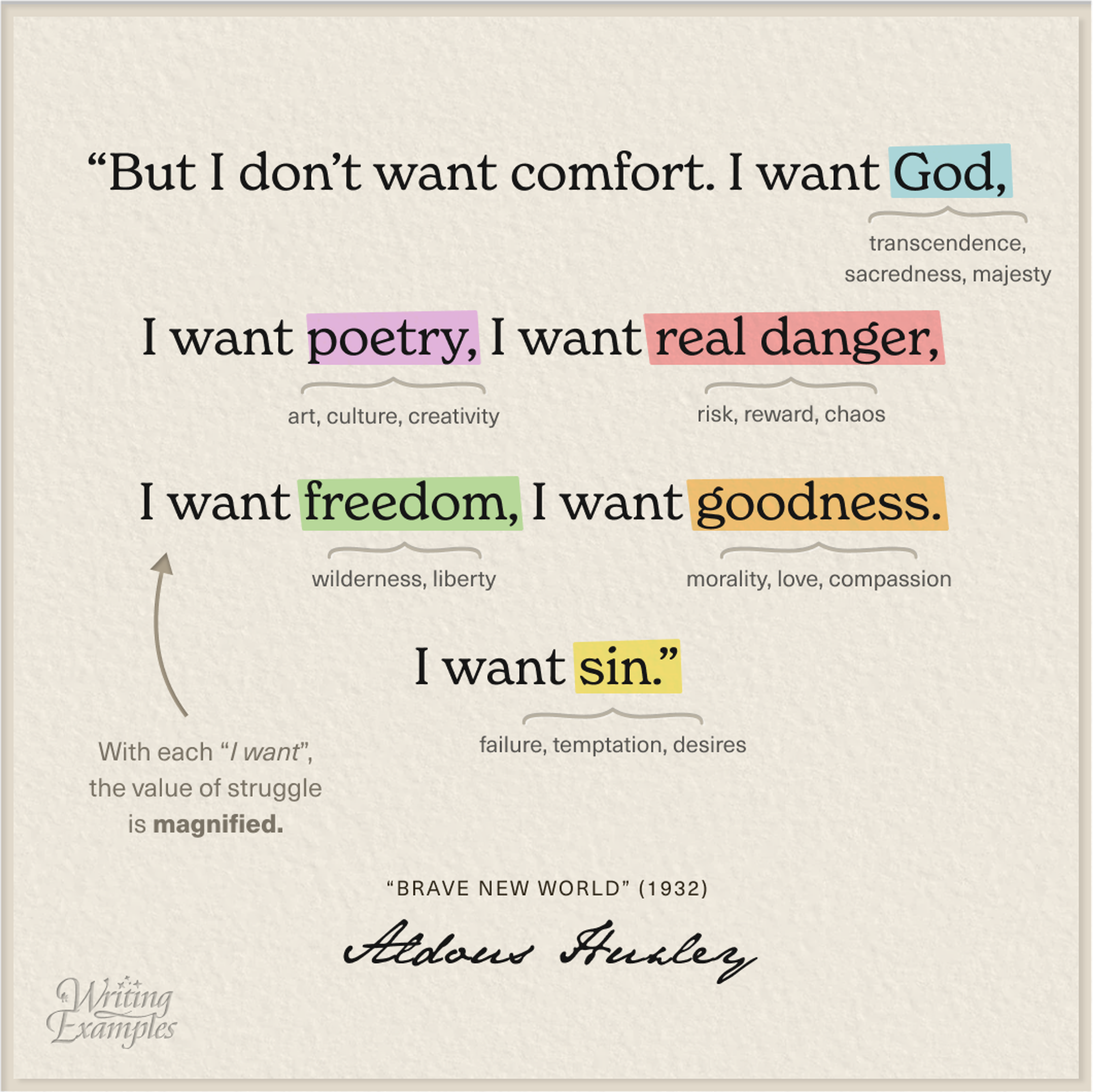 With each “I want”, the value of struggle is magnified. With each “I want,” Huxley passionately rejects superficial “happiness” in favor of real, complex experiences. With each “I want,” Huxley highlights the urgent desire for something deeper, painting a vivid contrast between comfort and the vibrant violence of an imperfect life.