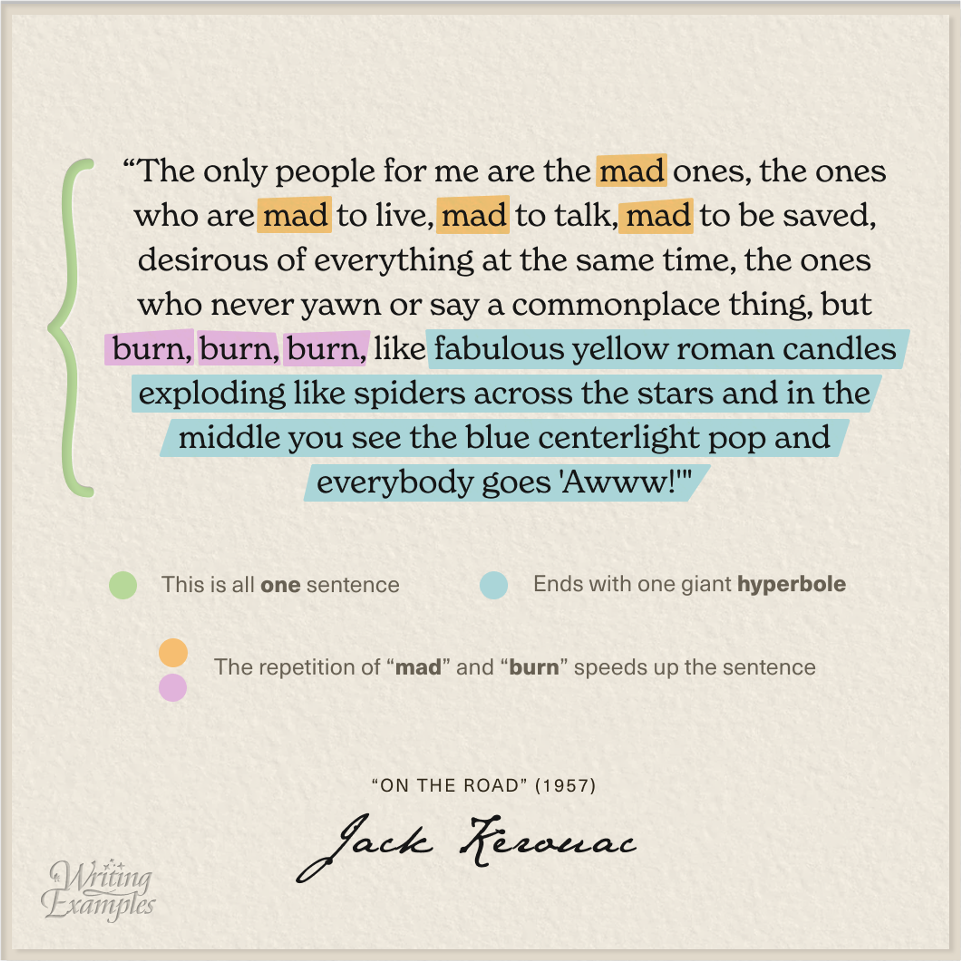 Then there’s hyperbole. If you’re going to use it, make sure the exaggeration is so grand that nobody could possibly mistake it for truth. Kerouac knew this. Like, obviously these people yawn, and obviously they say commonplace things, and obviously these people don’t explode like spiders. But the extremes paint a vivid and rapturous scene – a sense of passionate energy that breaks the conventions of grammar and syntax.