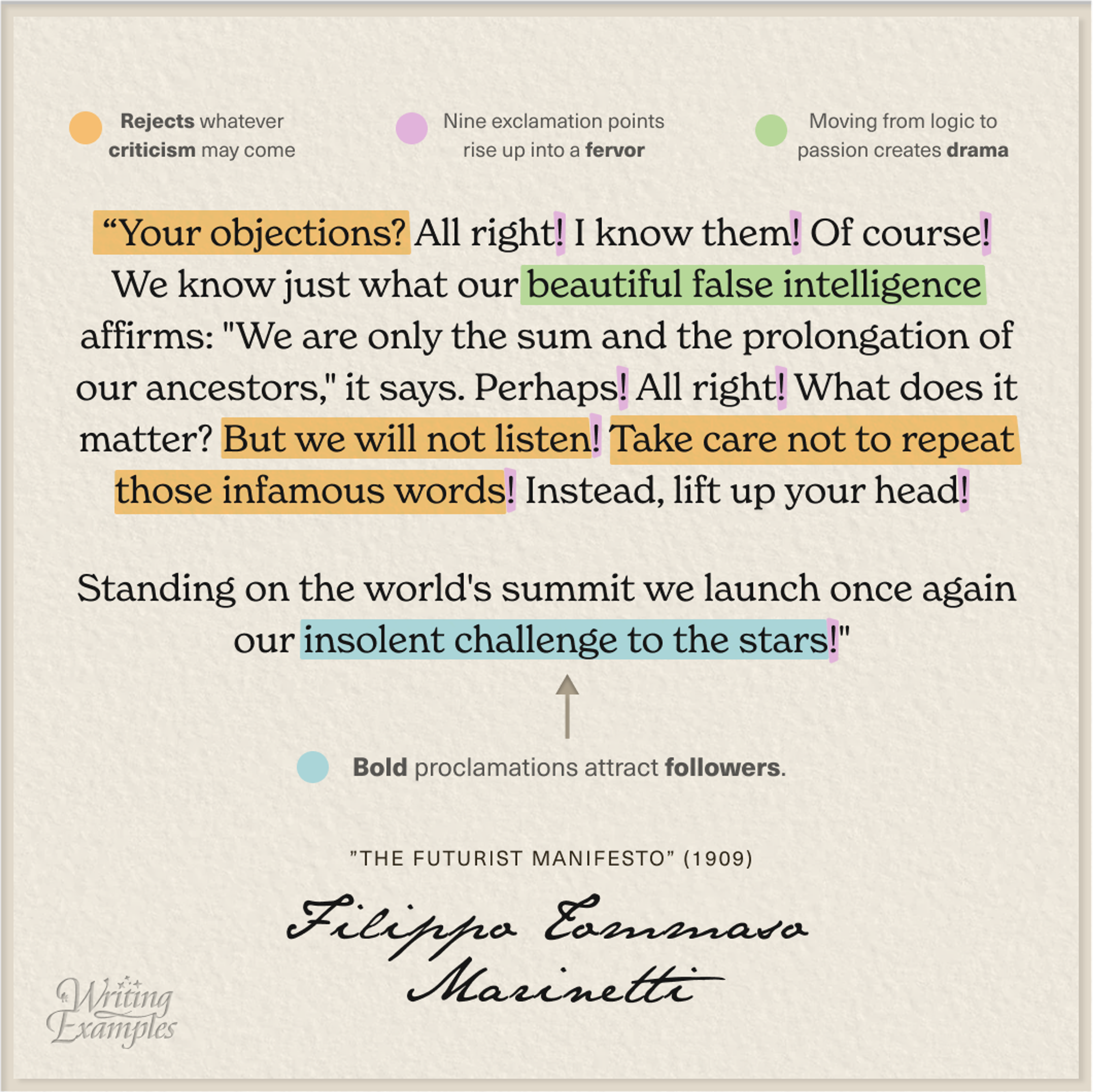 Manifestos are defined by their energy. Short sentences. Bold proclamations. Dramatic language. In this one, the rhetorical questions make us feel like we’re being spoken to directly. And when was the last time you saw so many successive sentences end with exclamation points? The writing shouts from the rooftop and screams: “Listen to me and rise up!!!”