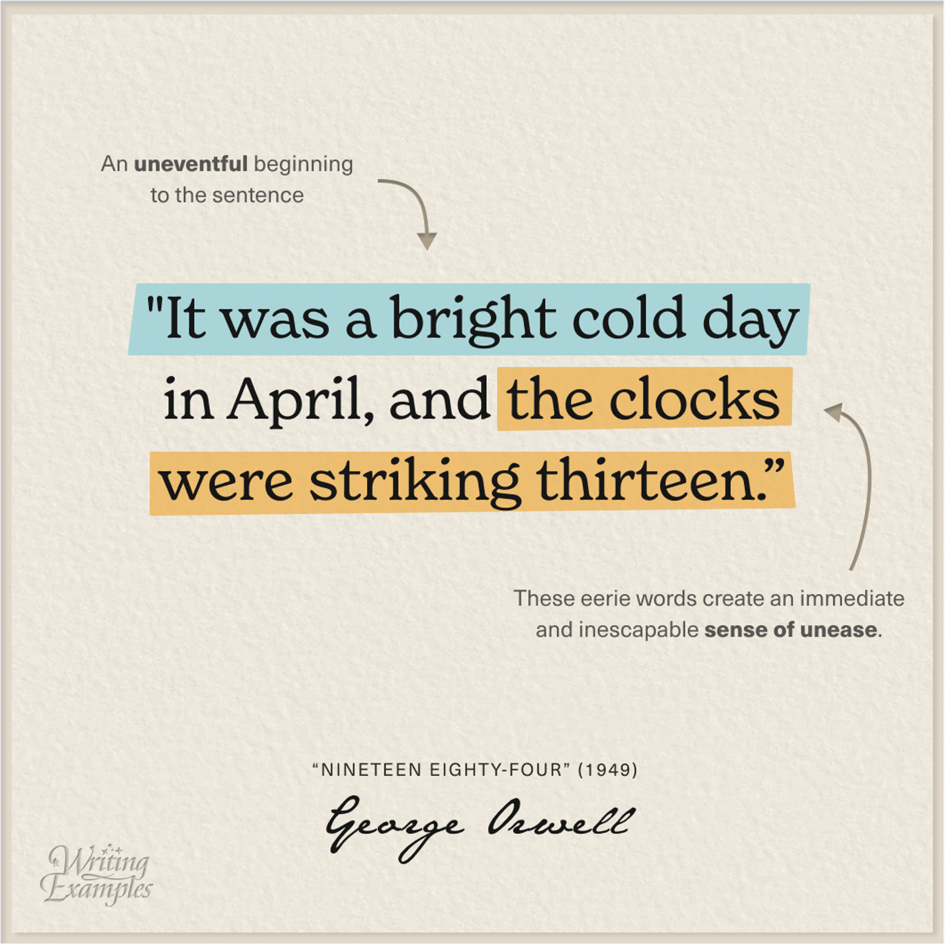 But things shift in the second half of the sentence when Orwell gives you an immediate and inescapable sense of unease — in just five words: “the clocks were striking thirteen.” With this, he foreshadows the rest of the novel, showing us that the rules of this society are different. This first sentence is a warning. Orwell is saying: “Question what you’re being told.”