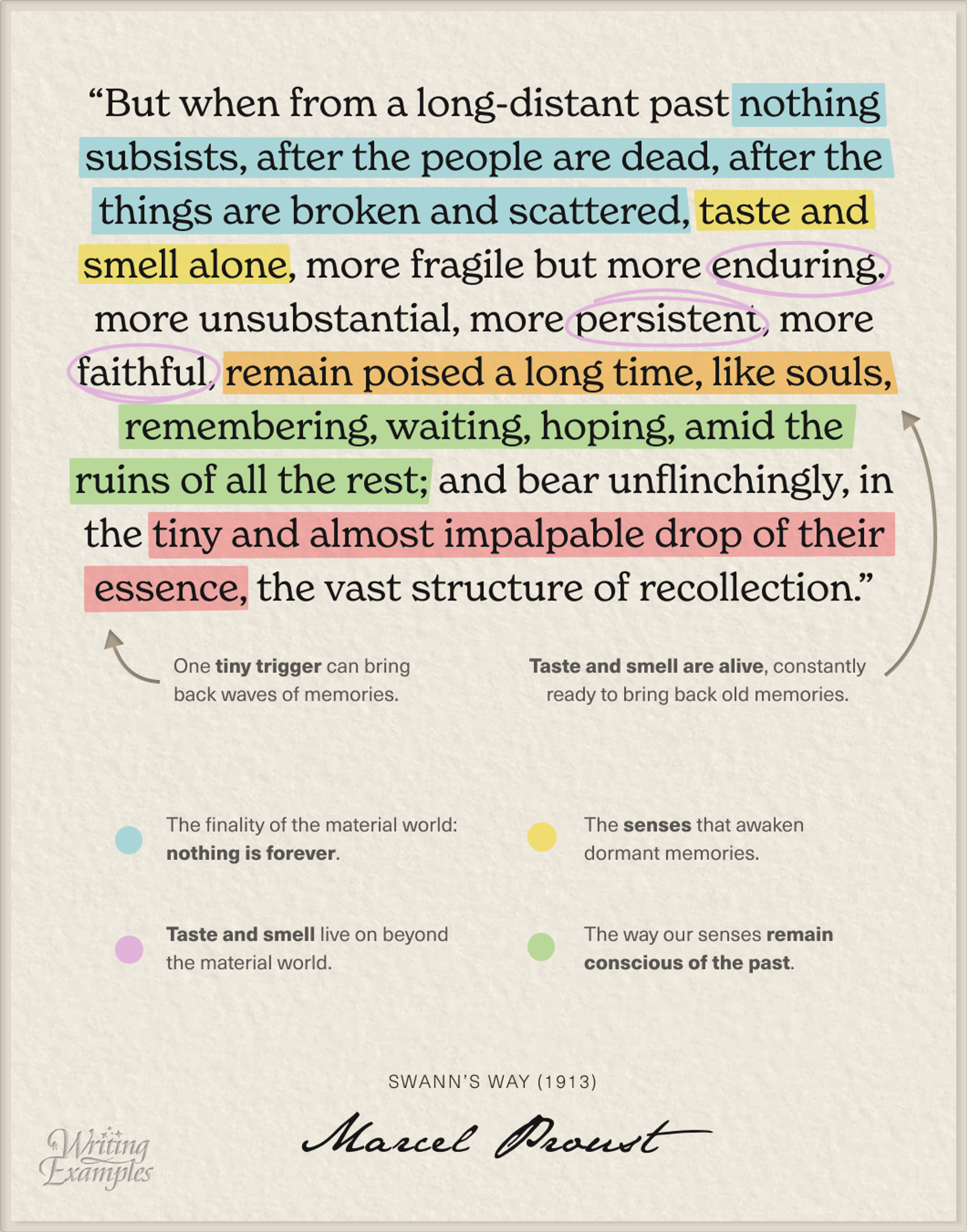 Memory, a la Proust, is brought back to life by the five senses. When describing memory, indulge in every detail and write about the senses that bring back those memories. Use long, flowing sentences to reflect the expansive, layered nature of memory, and contrast minuteness with immensity, because "a drop" of the senses can bear "the vast structure" of what we think we’ve forgotten.