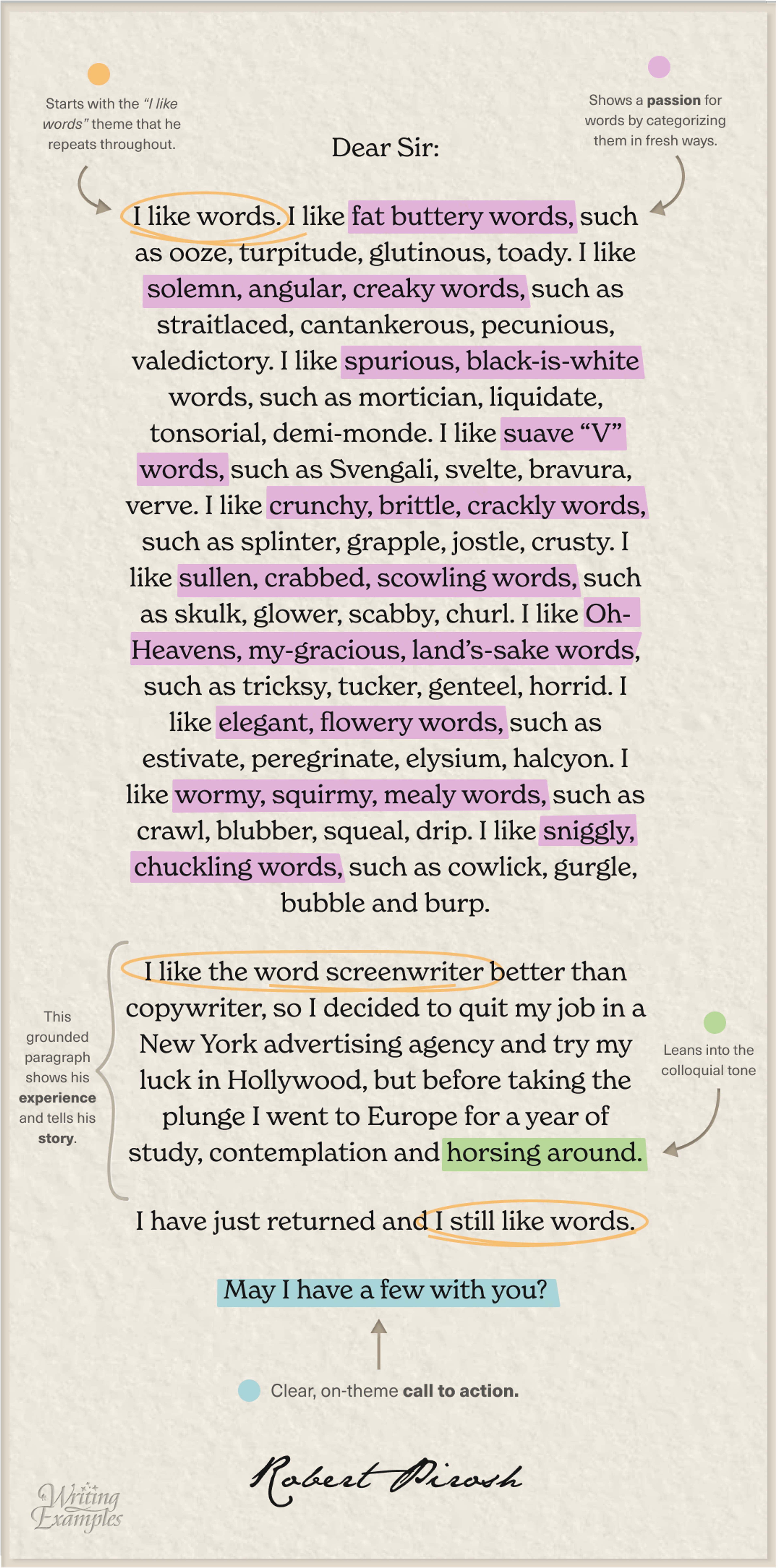 Pirosh is a screenwriter, but this approach is far more effective than if he’d pitched his script ideas. Recruiters scan cover letters, so you have to catch their attention fast. It only takes a glance to see that Pirosh has done something different.