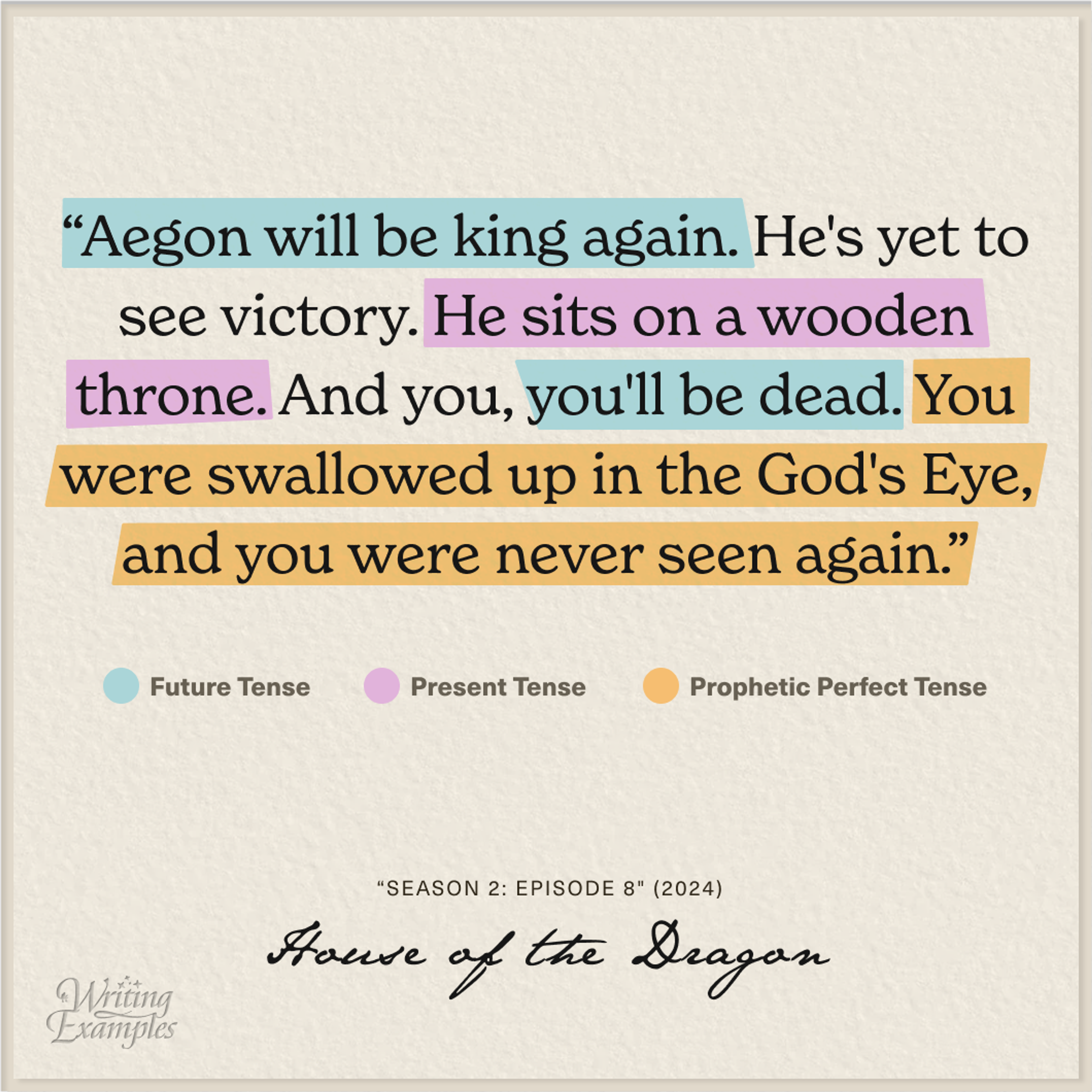 Helaena speaks of something that will happen in the future as if it has already happened. She prophesies her brother will drown in the God’s Eye lake in an upcoming battle, and Aegon will win the throne once again.